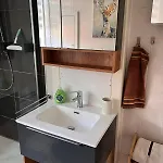 The apartment is equipped with a bathroom that features slippers.